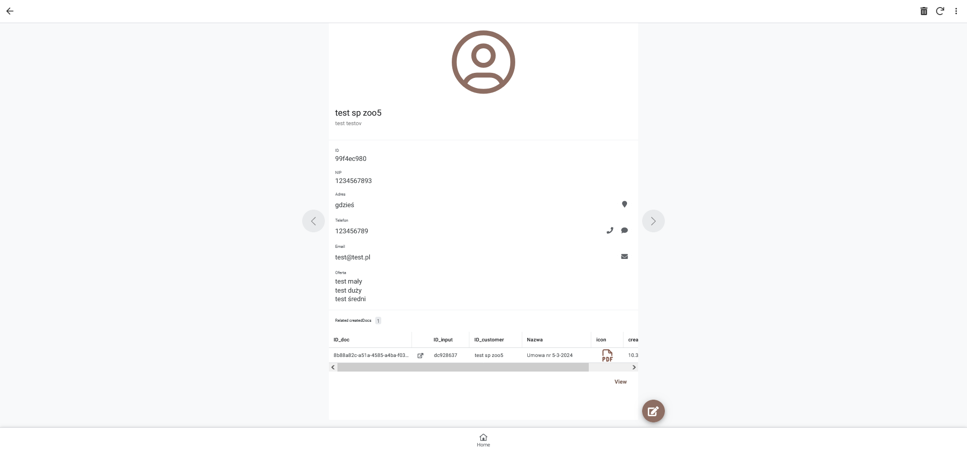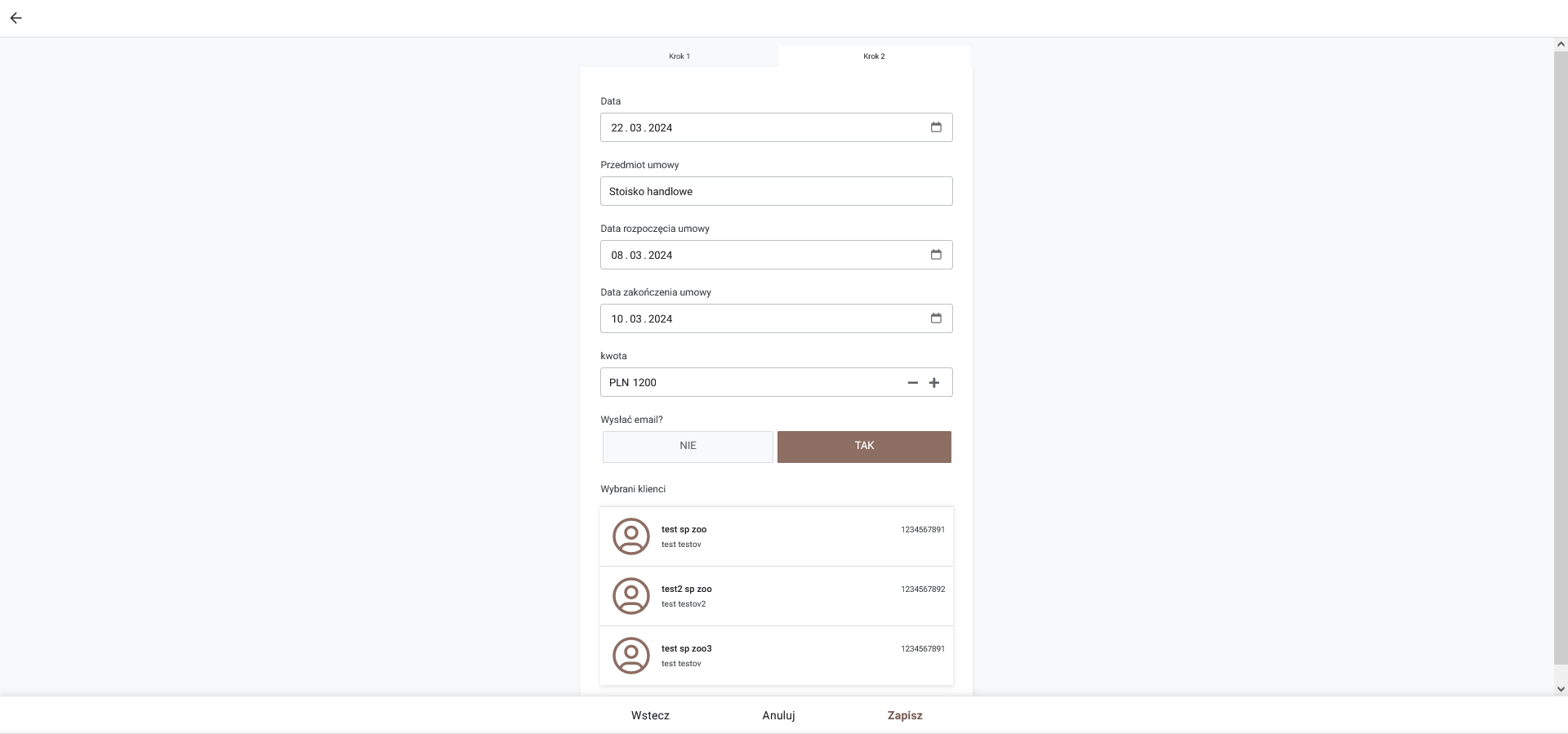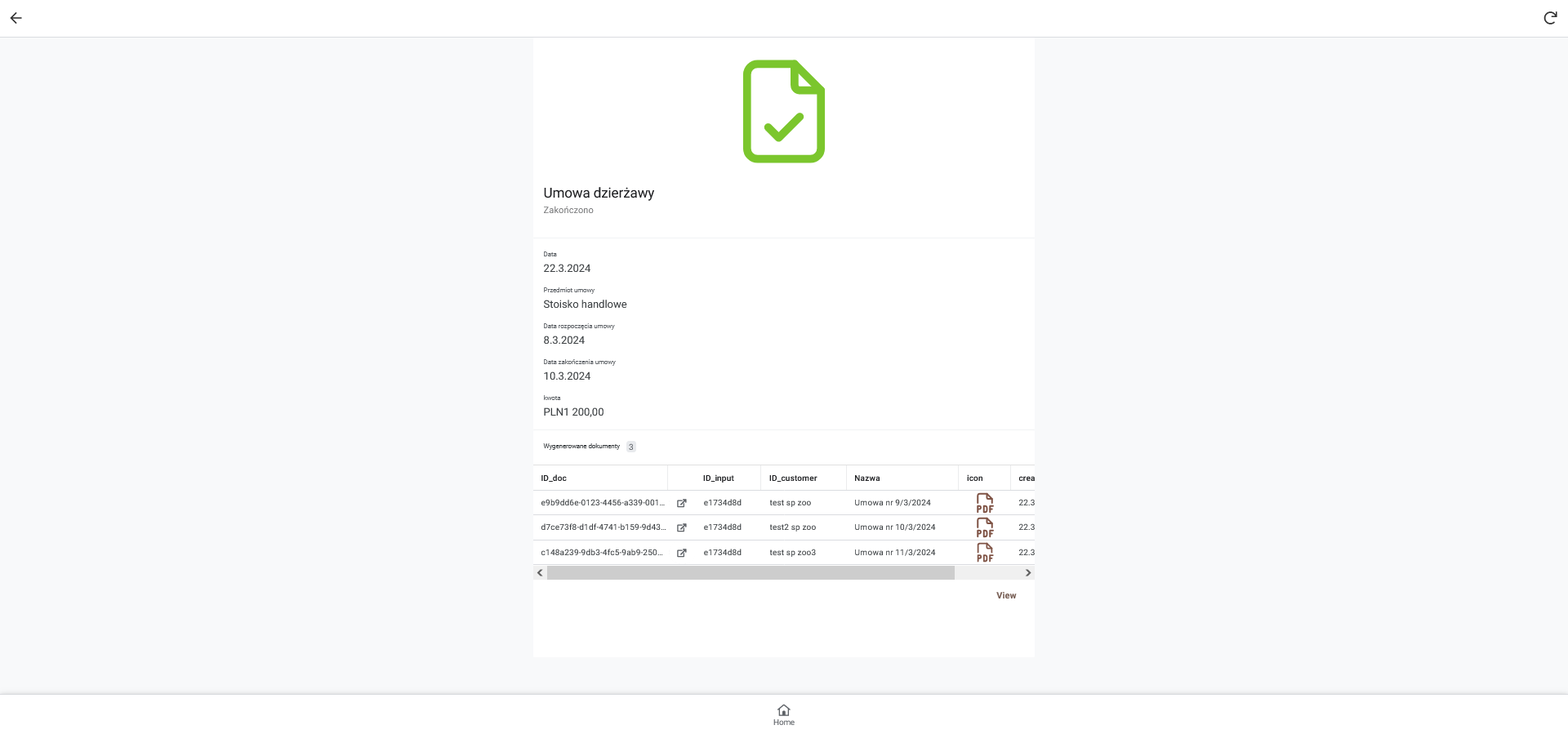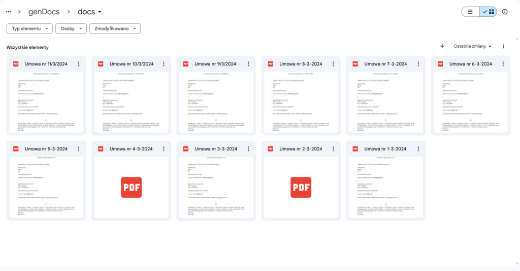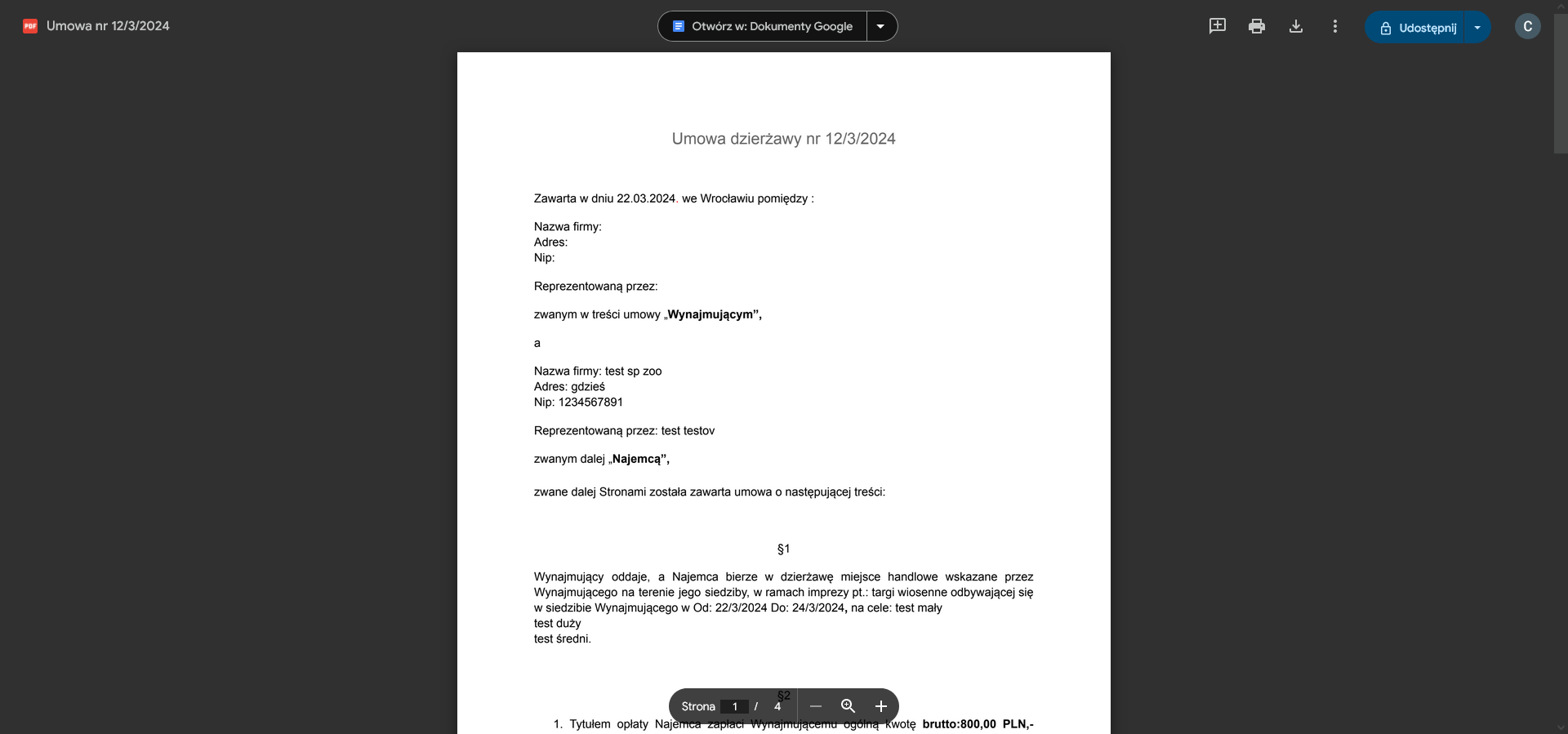 Umowy generowane są w formacie pdf a następnie zapisywane na dysku google, co daje do nich swobodny dostęp zarówno z poziomu google drive jak i aplikacji.